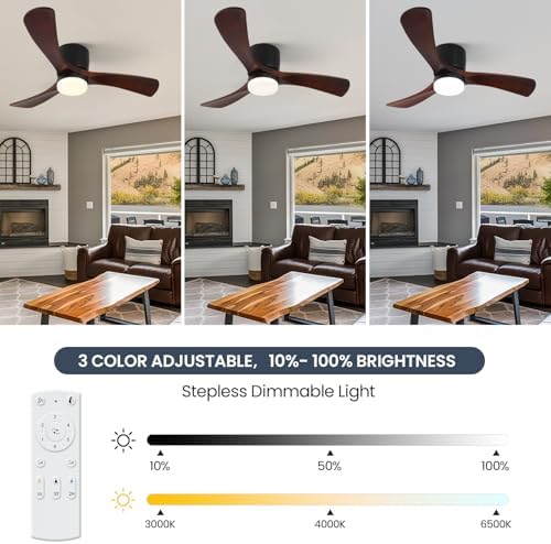LOW PROFILE CEILING FAN WITH LIGHT: The 42 inch flush mount ceiling fan consists of a matte black body and 3 walnut-colored wooden fan blades that will bring a unique and sophisticated touch to your room. With a height of only 8.7 inches, it will fit perfectly even on low floors of TCL 52″ Black Ceiling Fan with Light.