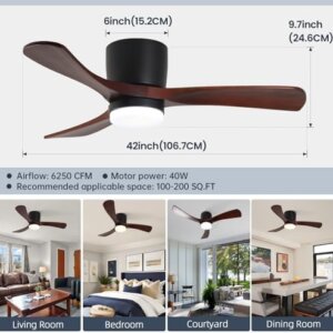 GESUM 42″ Ceiling Fan with Lights Remote Control, Low Profile Ceiling Fan with 3 Walnut Wood Blades