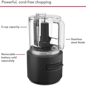 • The KitchenAid Cordless Food Chopper KFCR500 in Black Matte offers cordless convenience and powerful chopping—battery sold separately.