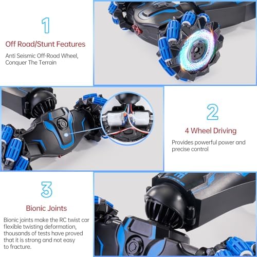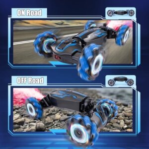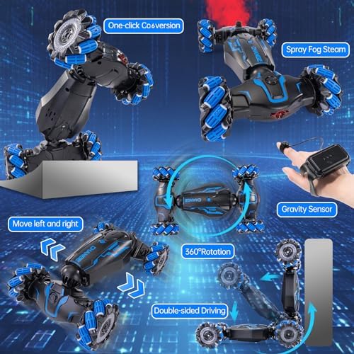 Gesture sensing rc stunt car comes with unique roller traction tyres for indoor and outdoor adventures such as gravel, lawn, sand, dirt, stairs, etc., very flexible and easy to control Convenient Charging Mode: Cool stunt rc car comes with two rechargeable batteries, which is convenient to charge. Shining lights and cool music with spray immerse boys and girls immerse themselves in the fun of driving the car Cool Present For Kids:
