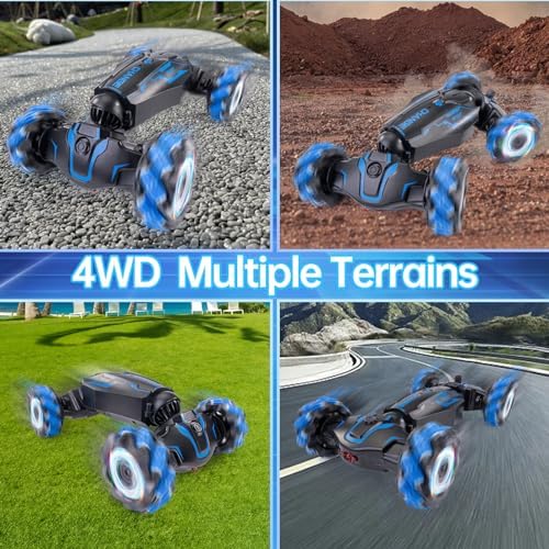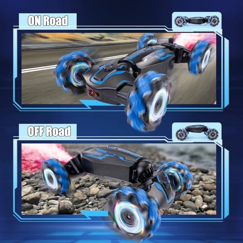 Two Control Modes: You just need to wear the gravity sensor watch and move your hands to enjoy the fun of operating the car freely or control it directly through the remote control, and the 2.4 GHz technology supports multiple cars racing at the same time Full Functional Stunts: 4WD rc stunt car can move left and right, walk on both sides, drift in all directions, flip on both sides, rotate 360°, race car drift and switch between on-road mode and off-road mode, giving your kids a surprising play experience Suitable For All Terrains: